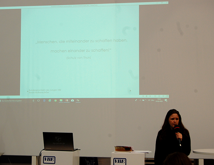 Die Bundessprecherin Kerstin Ruthenschröer vom Jungen Verband Bildung und Erziehung (Junger VBE) studierte Primarstufe an der Westfälischen Wilhelms-Universität Münster und absolvierte ihr Referendariat am heutigen Zentrum für schulpraktische Lehrerausbildung in Rheine. Sechs Jahre war sie als Vertretungslehrkraft tätig und ist heute Konrektorin an einer Grundschule im Kreis Steinfurt. Zudem fungiert sie als Personalrätin im ÖPR Steinfurt und im Bezirkspersonalrat für Grundschulen in Münster. Zum Deutschen Lehrertag 2018 ist sie Teil des neuen Programms speziell für Junglehrer.